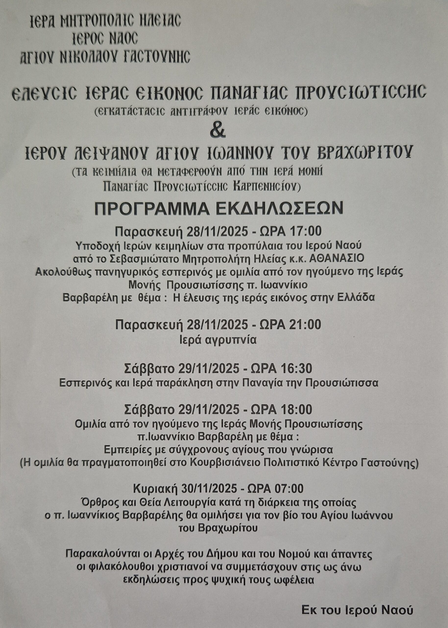 Πρόγραμμα Εκδηλώσεων Ι. Ν. Αγίου Νικολάου Γαστούνης